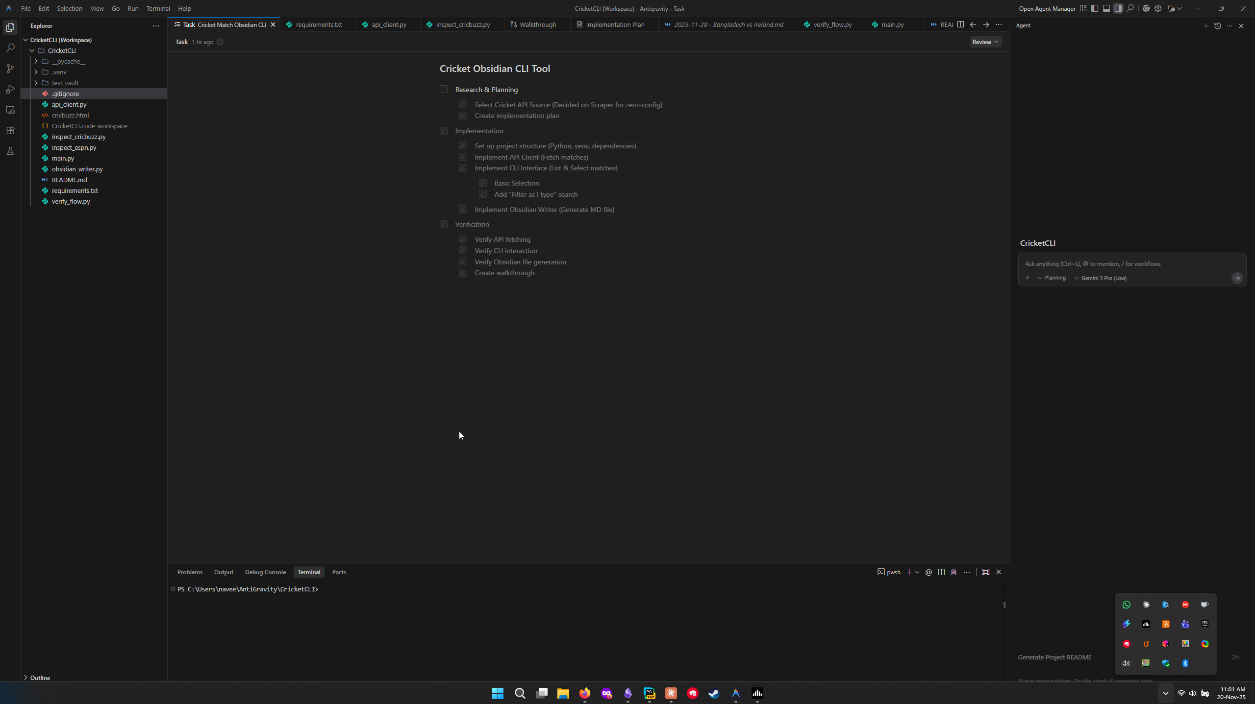 I told the agent what I wanted to do, it created a Implementation Plan markdown, as well as Tasks markdown. Then step by step, from analyzing the Cricbuzz HTML structure to testing by creating a dummy file, it built the tool.