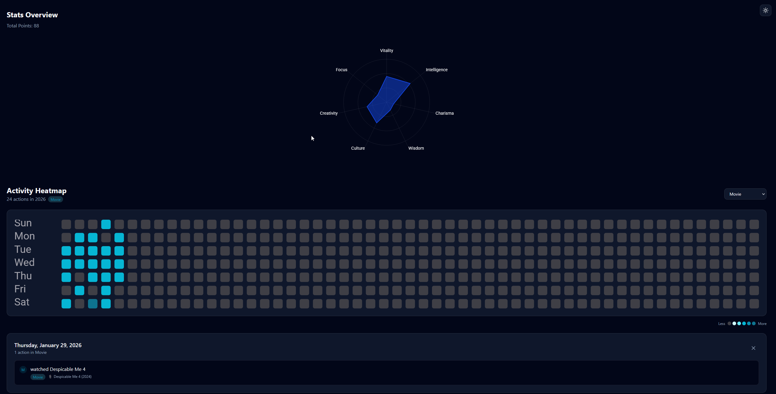 The bones were done. Now I just needed to dress it up. I served the points and actions from the SQLite database using REST endpoints (FastAPI). I consumed these endpoints in the frontend (Svelte) to present them in a radar chart showing my stat distribution and a heat map tracking daily activity patterns.