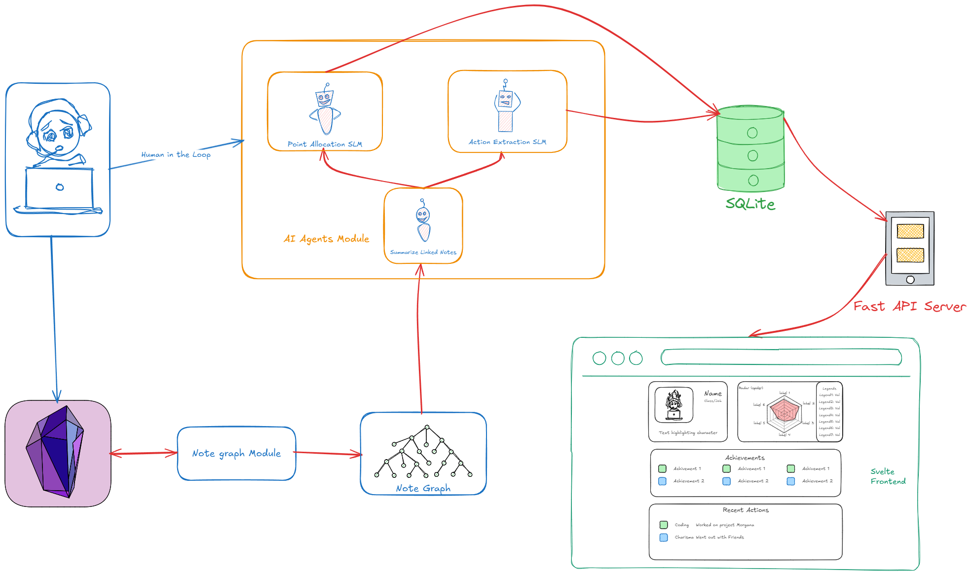 I needed something that could parse natural language into tangible actions. And of course AI is the solution, like for everything nowadays. Of course, I had to tackle my other problem: the lack of motivation to write down stuff. One thing led to another and I decided to gamify the whole process—my life.
